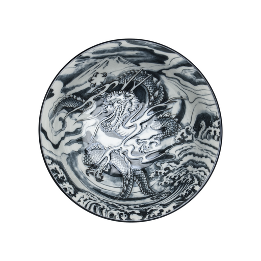 Japanese ceramic bowl decorated with a dramatic dragon, mountain and wave design. The larger diameter makes this a perfect bowl for ramen but can b...