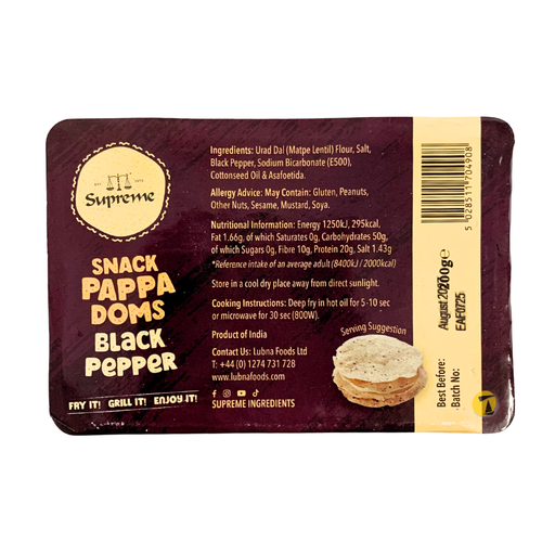 Brand: SupremeIngredients: Urad Dal (Matpe Lentil) Flour, Salt, Black Pepper, Sodium Bicarbonate (E500), Cottonseed Oil And Asafoetida.Allergy Advi...