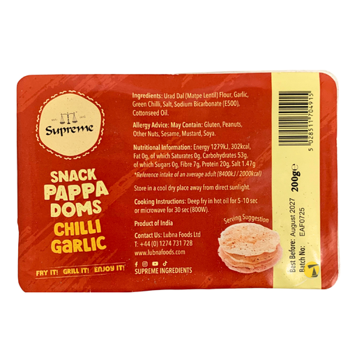 Brand: SupremeIngredients: Urad Dal (Matpe Lentil) Flour, Garlic, Green Chilli, Salt, Sodium Bicarbonate (E500), Cottonseed Oil. Allergy Advice: Ma...