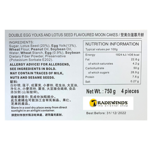 Tin of 4 MooncakesBrand: October Fifth BakeryIngredients: Sugar, Lotus Seed (20%), Egg Yolk (13%), Wheat Flour, Peanut Oil, Soybean Oil, Water, Whe...